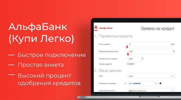 АльфаБанк (Купи Легко) – это онлайн платформа для кредитования покупателей интернет-магазинов. «Купи легко» позволяет приобрести товар в кредит непосредственно в момент оформления заказа на сайте. Заполнив онлайн-анкету, в течение нескольких минут получаете решение Банка. Подписание кредитных документов осуществляется сотрудником Банка.
