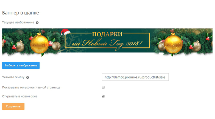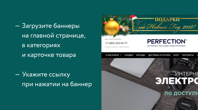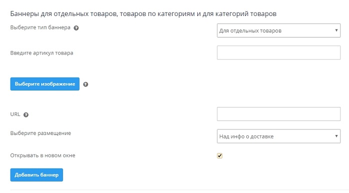 - загружать баннеры в формате: jpeg, jpg, png и gif на главной странице, в категориях и товарах Вашего интернет-магазина;