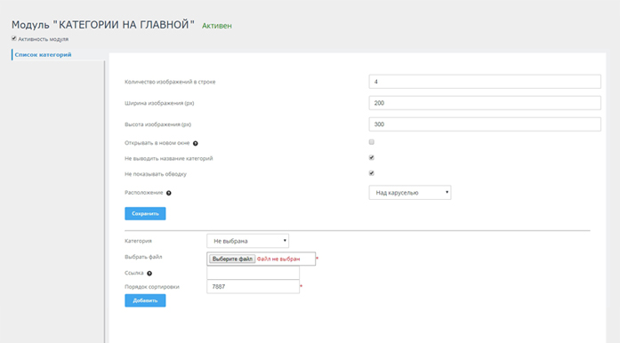 Модуль имеет множество настроек для изменения визуального отображения категорий на главной странице: количество категорий в строке, размер изображения, сортировка, применение эффектов при наведении курсора на изображение и другие.