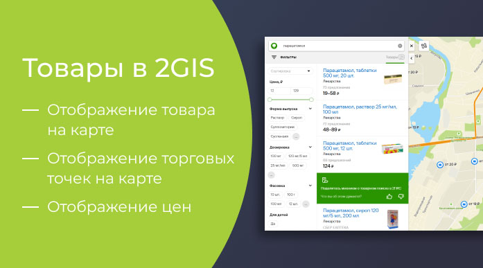 Товарный поиск отображает торговые точки на карте с предложениями соответствующих компаний с ценами. Компании могут добавить информацию о своих товарах в 2ГИС с помощью Личного кабинета и данного модуля.