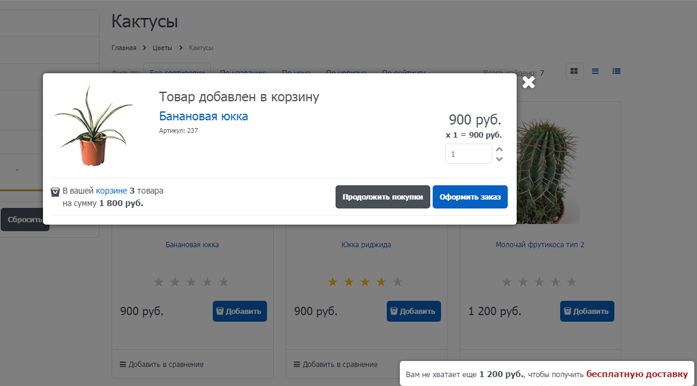 Модуль автоматически рассчитает и выведет клиенту сообщение в корзине, какое количество товаров и на какую сумму необходимо докупить, чтобы получить: Бесплатную доставку или Подарок от магазина.
